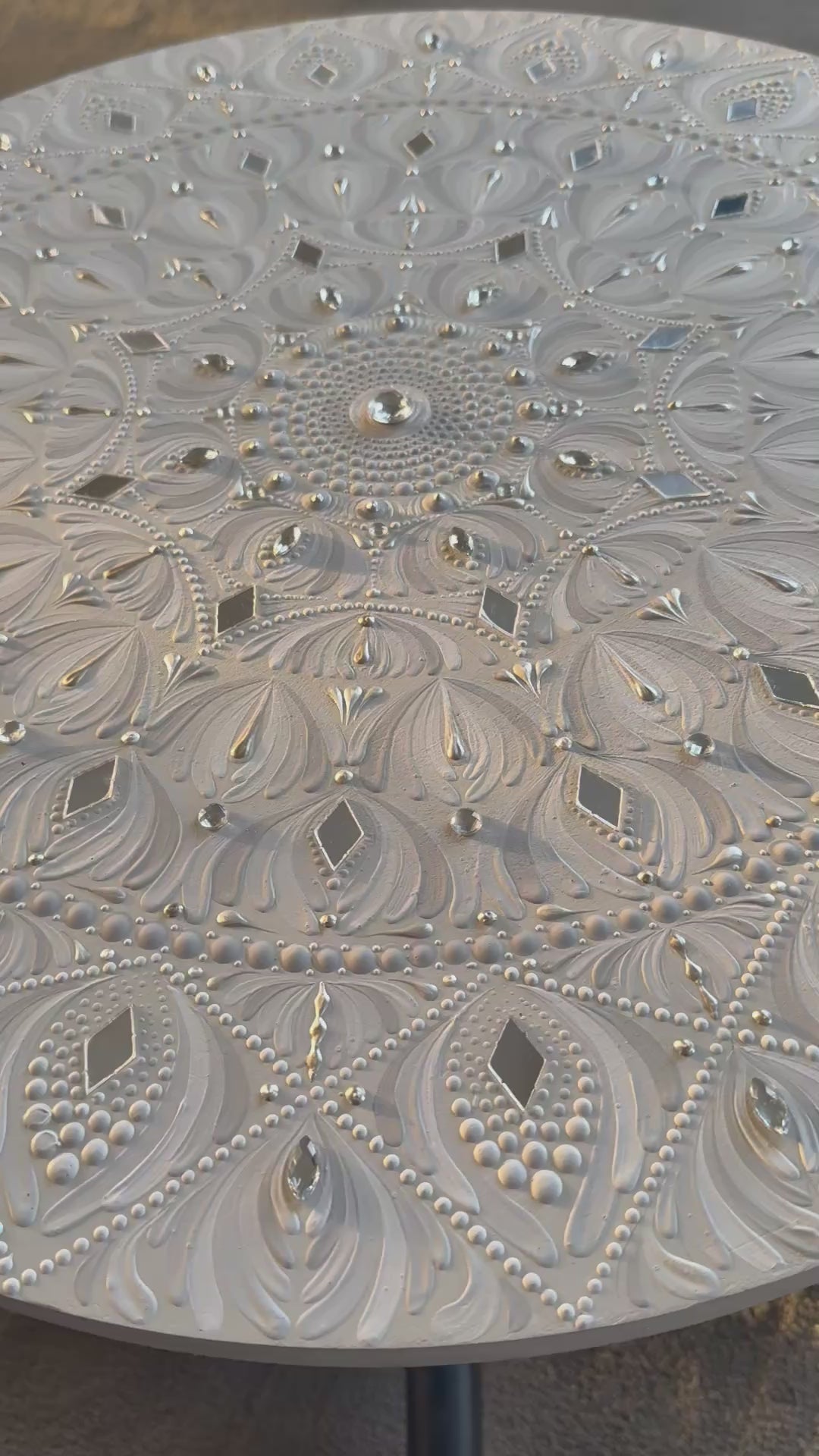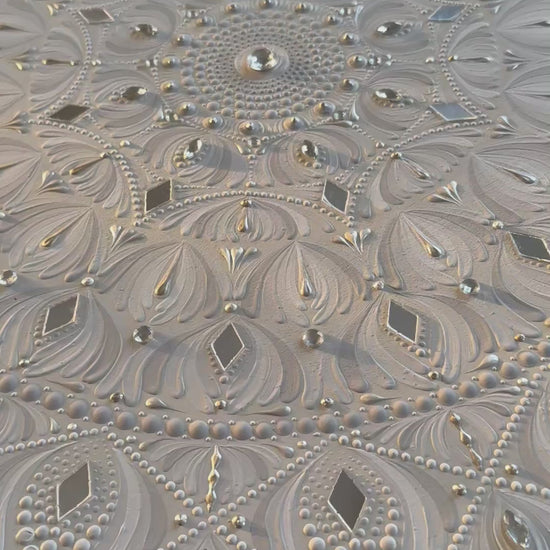 "New Beginnings" is a serene and introspective piece, part of the Petals and Paint collection. Painted in soothing whites and greys, this 60cm mandala features intricate mosaic mirror embellishments that add a touch of elegance and depth. Created during a significant moment of reunion and new beginnings, this piece embodies the beauty of fresh starts and the joy of coming home.
